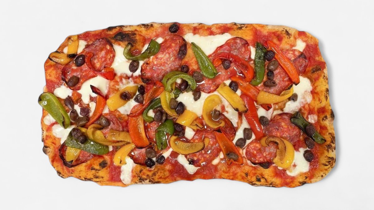 Tomatsaus, mozzarella, spianata, paprika og oliven