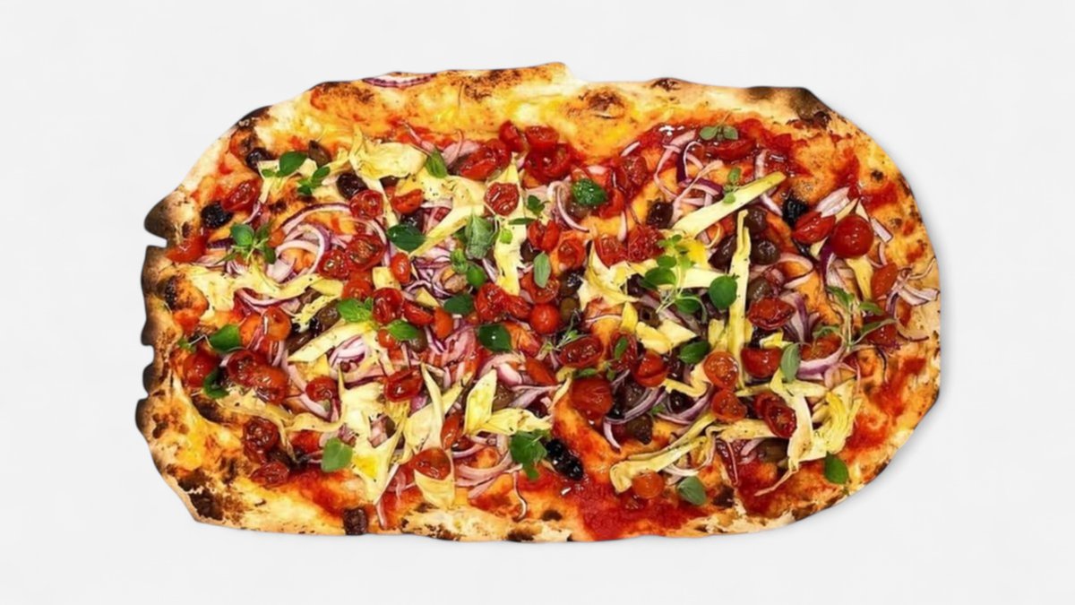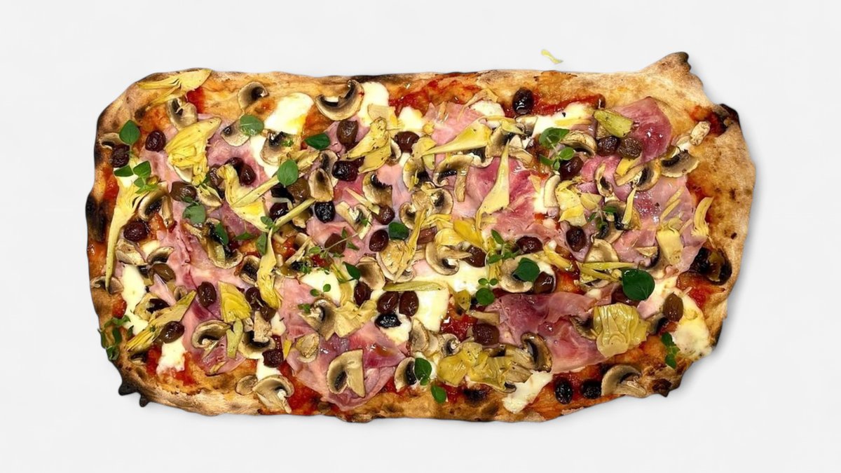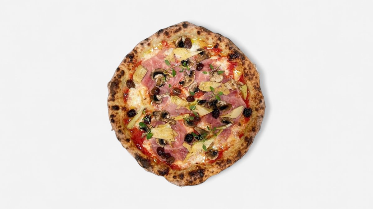 Tomatsaus, mozzarella, skinke, champignon, artisjokk, oliven, fersk oregano og olivenojle