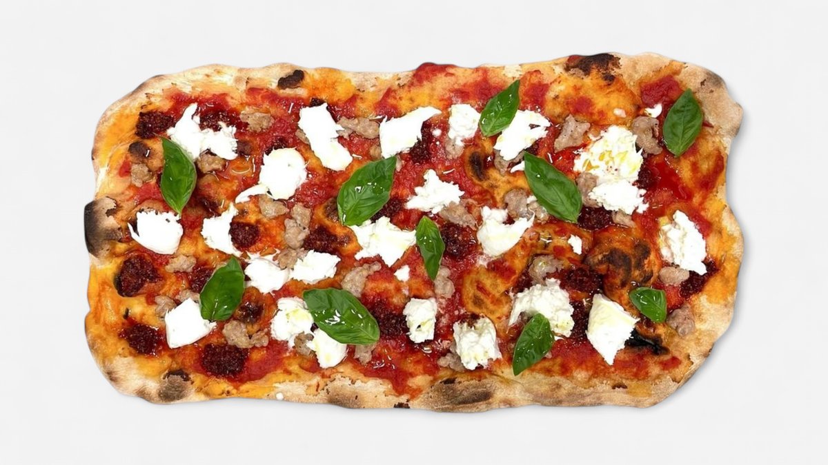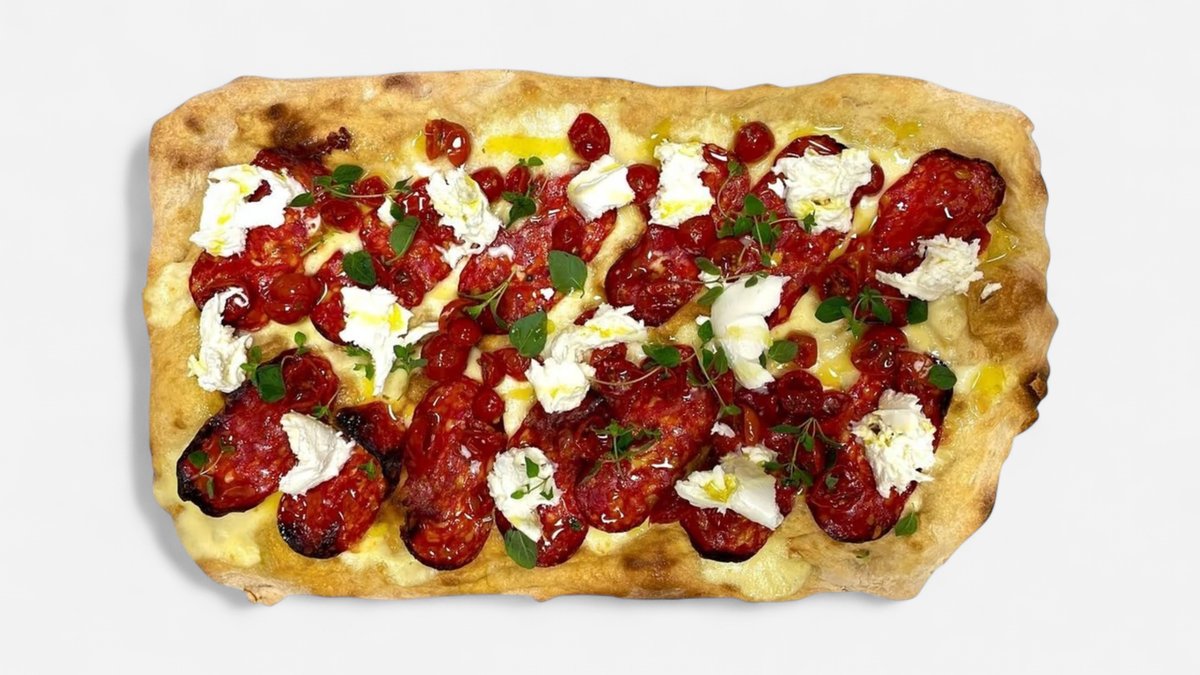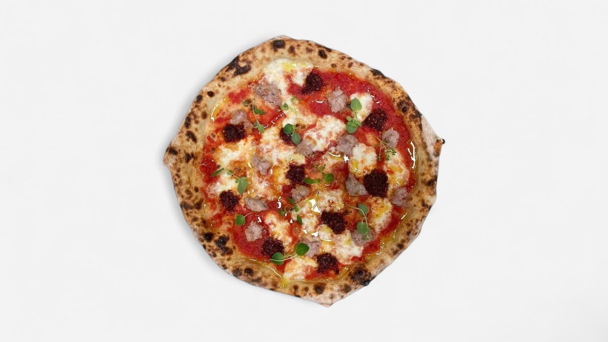 Tomatsaus, bøffelmozzarella, ‘nduja, salsiccia, habanero chilli, basilikum og olivenolje
