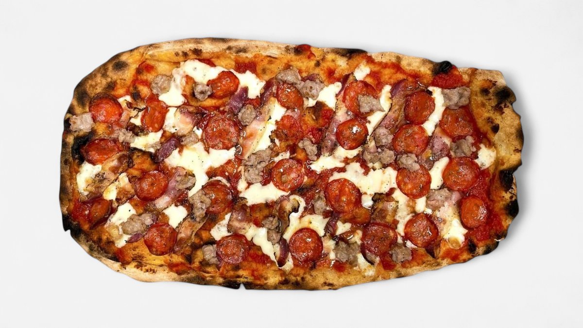 Tomatsaus, mozzarella, guanciale, salamino og salsiccia