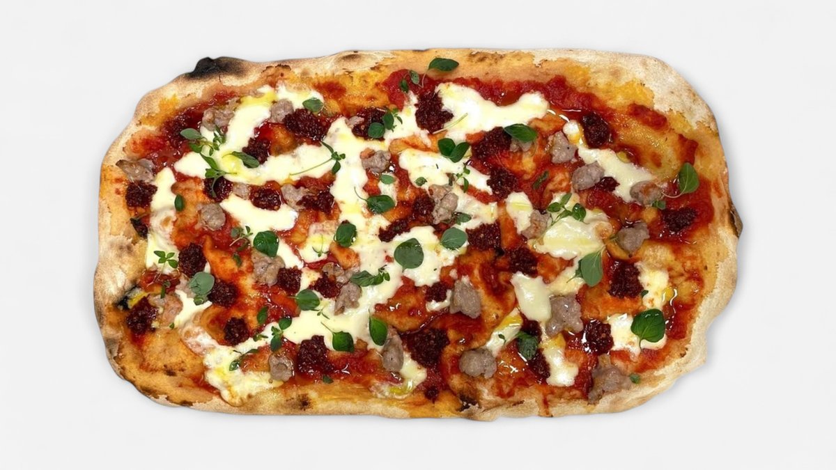 Tomatsaus, mozzarella, salsiccia, ‘nduja og fersk oregano