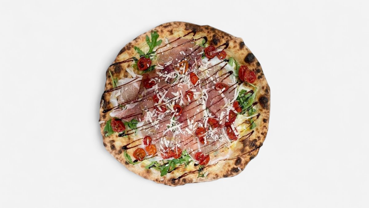 Mozzarella, parmaskinke, parmigiano, balsamico glasur, semitørkede tomater, ruccola og olivenolje