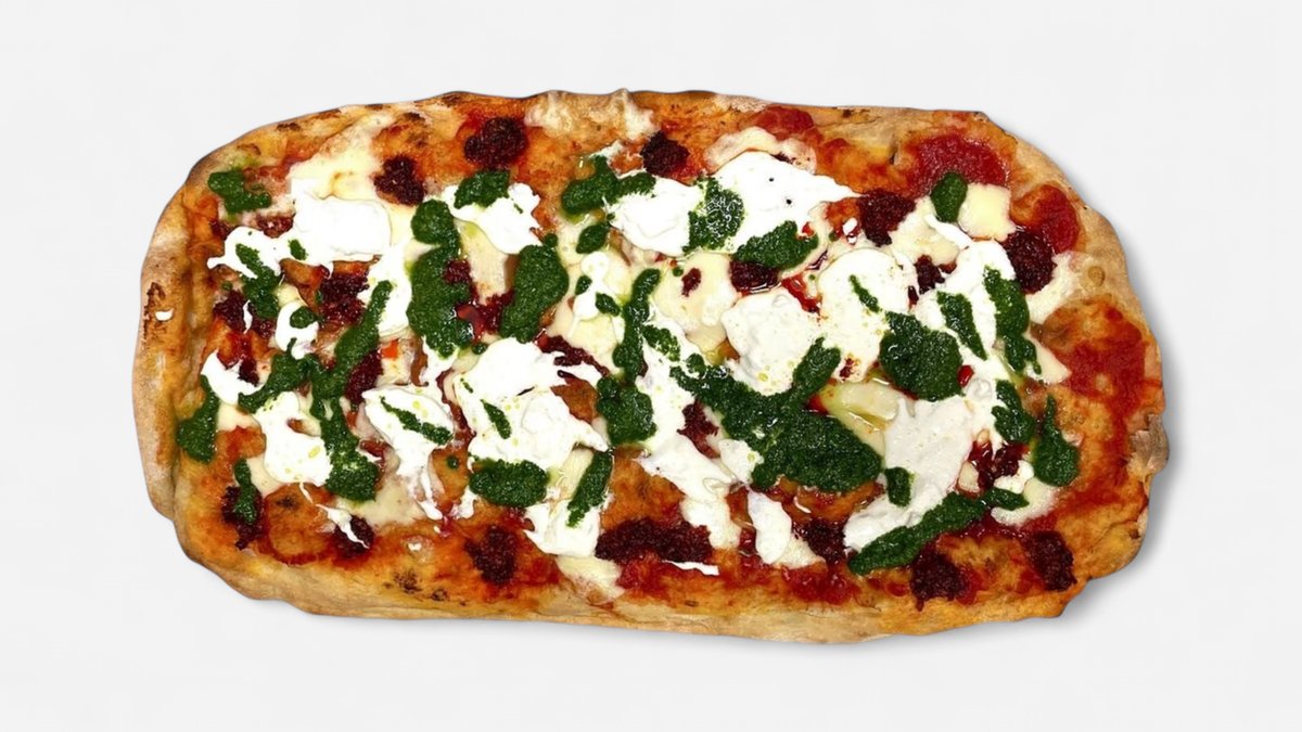 Tomatsaus, mozzarella, ‘nduja, burrata og ruccolapesto