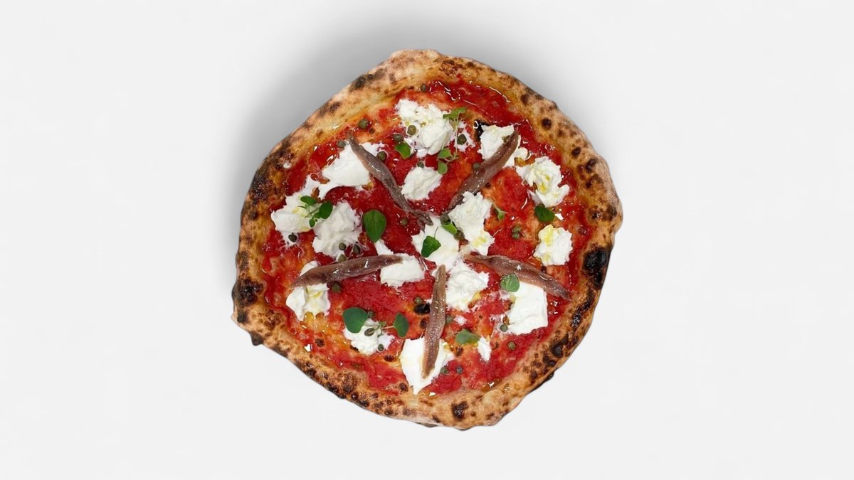 Tomatsaus, bøffelmozzarella, Cetara-ansjos, kapers, fersk oregano og olivenolje