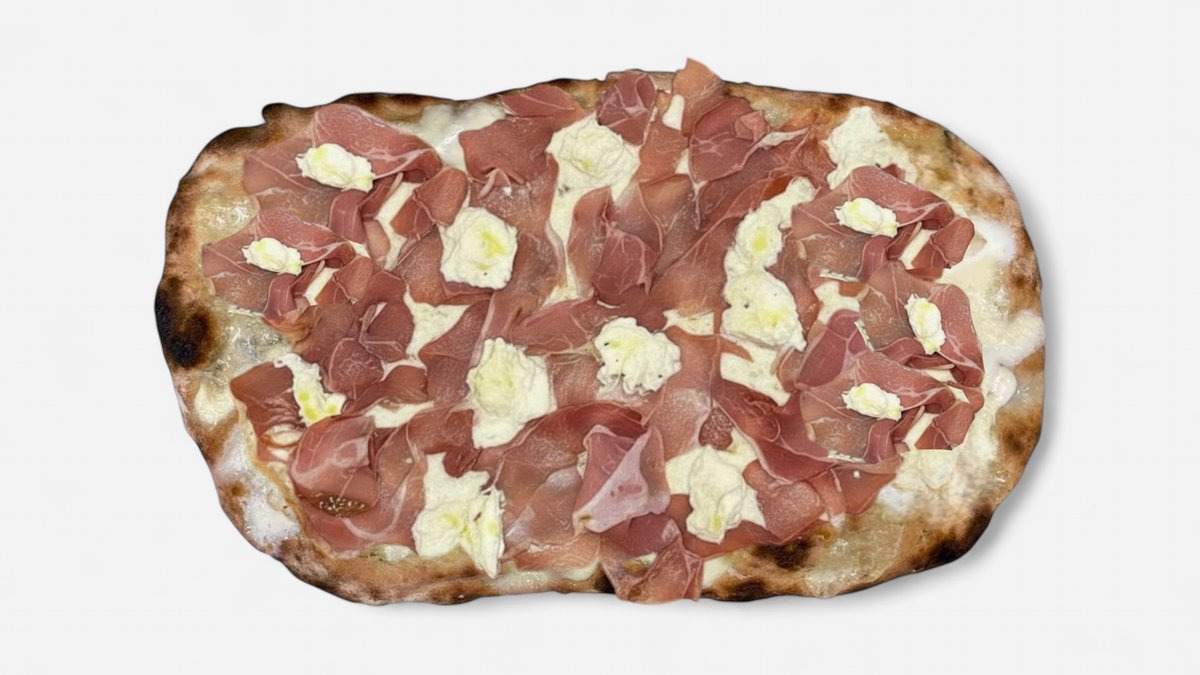 Gresskarkrem, mozzarella, guanciale, burrata, tarallo (salt kjeks) og fersk oregano