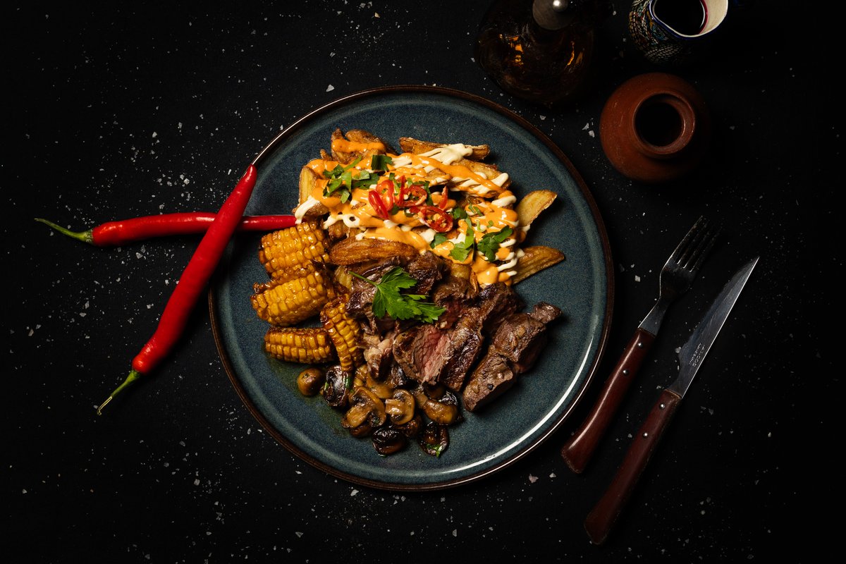 250g storfe entrecôte med stekt champignon, grillet mais og béarnaisesaus Inkludert Patatas Bravas Inneholder: melk, selleri, sulfitt, soya, egg, hvete