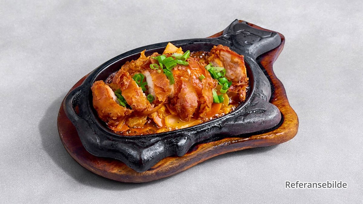 Serveres i en søt, syrlig og litt sterk saus med grønnsaker.