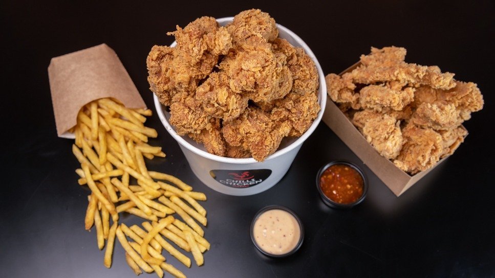 Kubełki pełne chrupiącego kurczaka oraz skrzydełek i dodatków