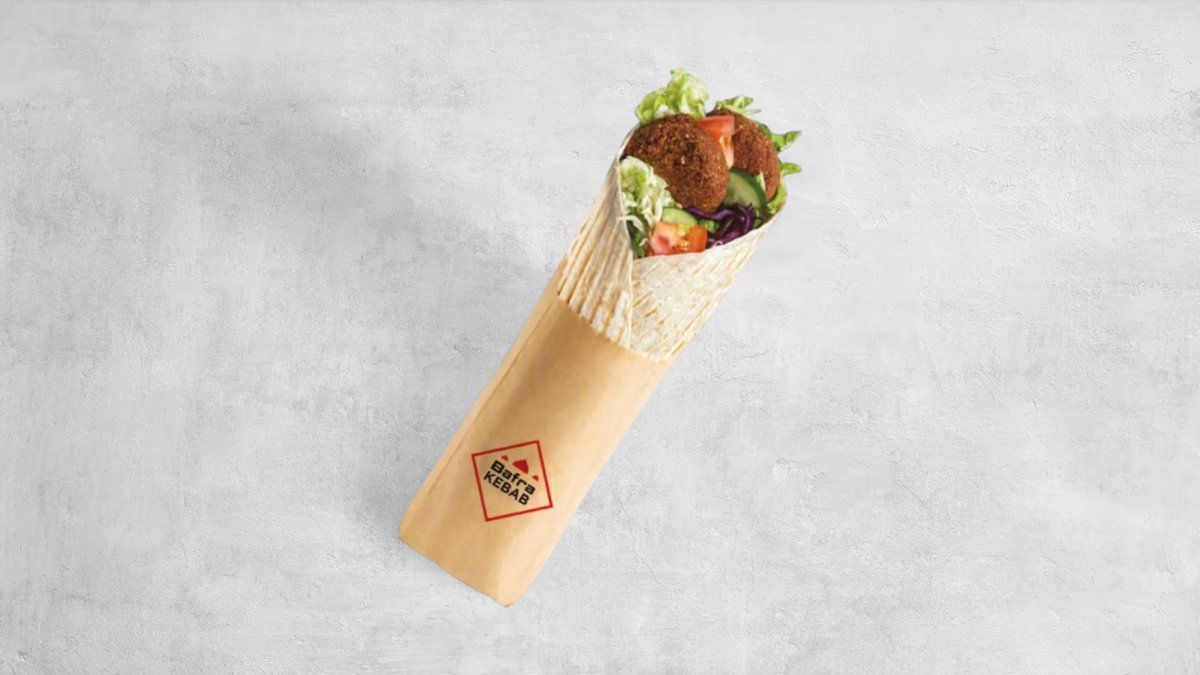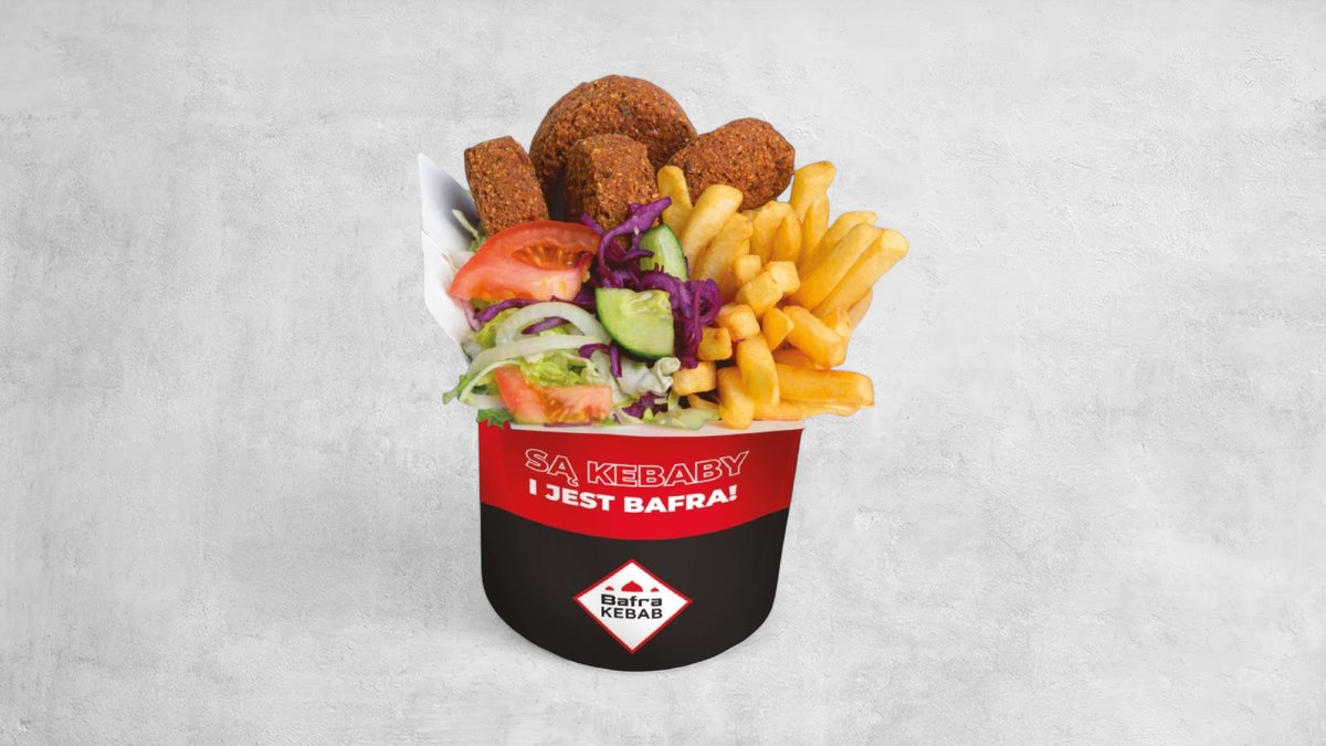 Falafel (140g), frytki, sałata lodowa, pomidor, ogórek, cebula czerwona. Sos do wyboru. Cena zawiera koszt za opakowanie