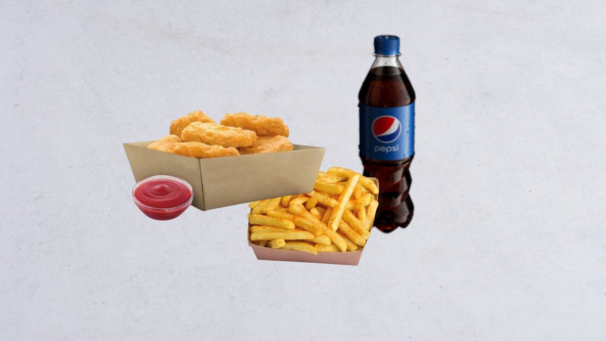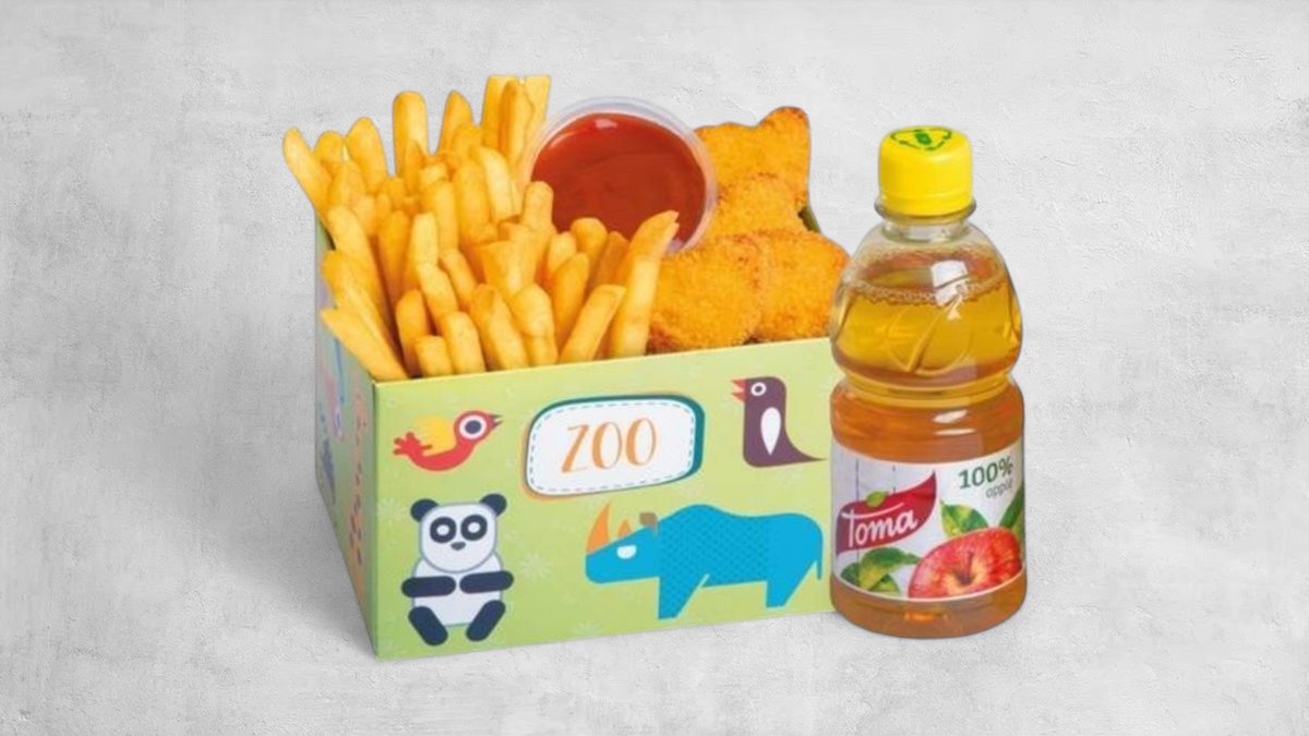 Frytki, stripsy (2 szt.), zabawka niespodzianka. Soczek lub woda do wyboru. Cena zawiera koszt za opakowanie