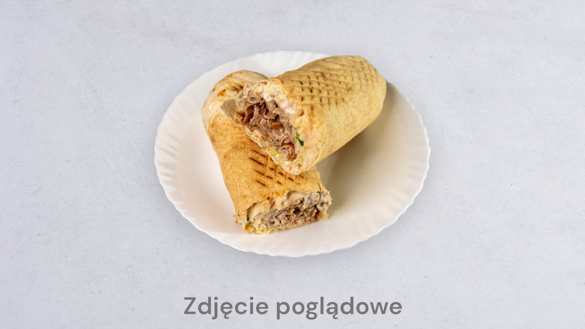 Tortilla, mięso wołowe mielone, sałata, kapusta, pomidor, ogórek, cebula, sos do wyboru