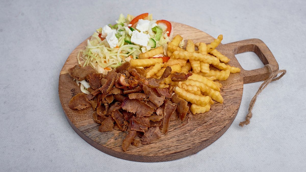 Mięso, frytki, ser, warzywa, sos