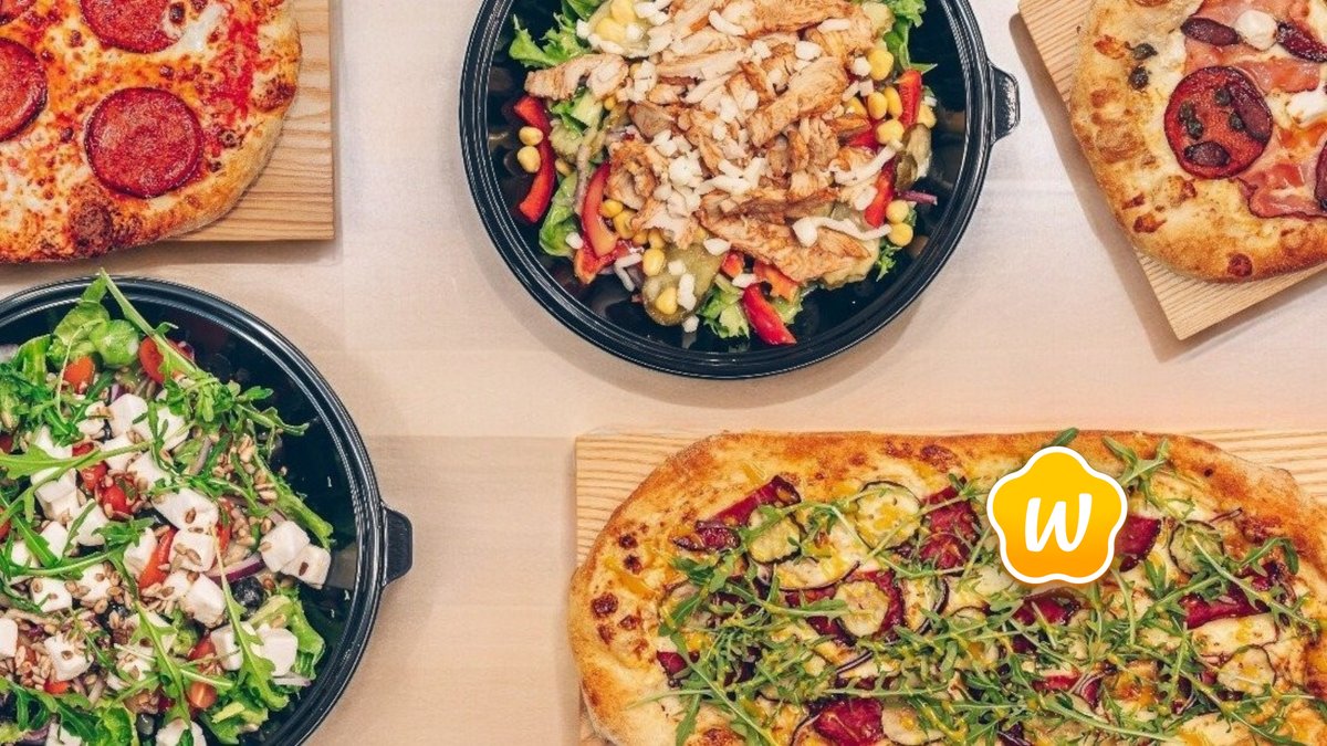 Mix sałat, kurczak, papryka, cebula, pikle, kukurydza, mozzarella