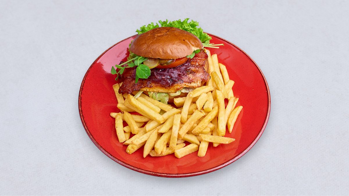 Z soczystą grillowaną piersią z kurczaka podawaną w bułce z plastrami aromatycznego boczku, karmelizowaną cebulką, sałatą lodową, pomidorem, ogórkiem konserwowym, kiełkami, oryginalnym sosem i frytkami