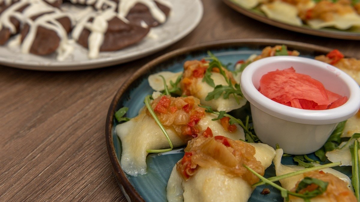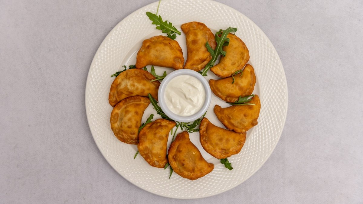 10 szt. Smażone żydowskie pierogi przygotowane z mięsa drobiowego i wątróbki, z dodatkiem marchewki i cebuli, aromatycznych przypraw z curry, podawane z sosem jogurtowo-czosnkowym