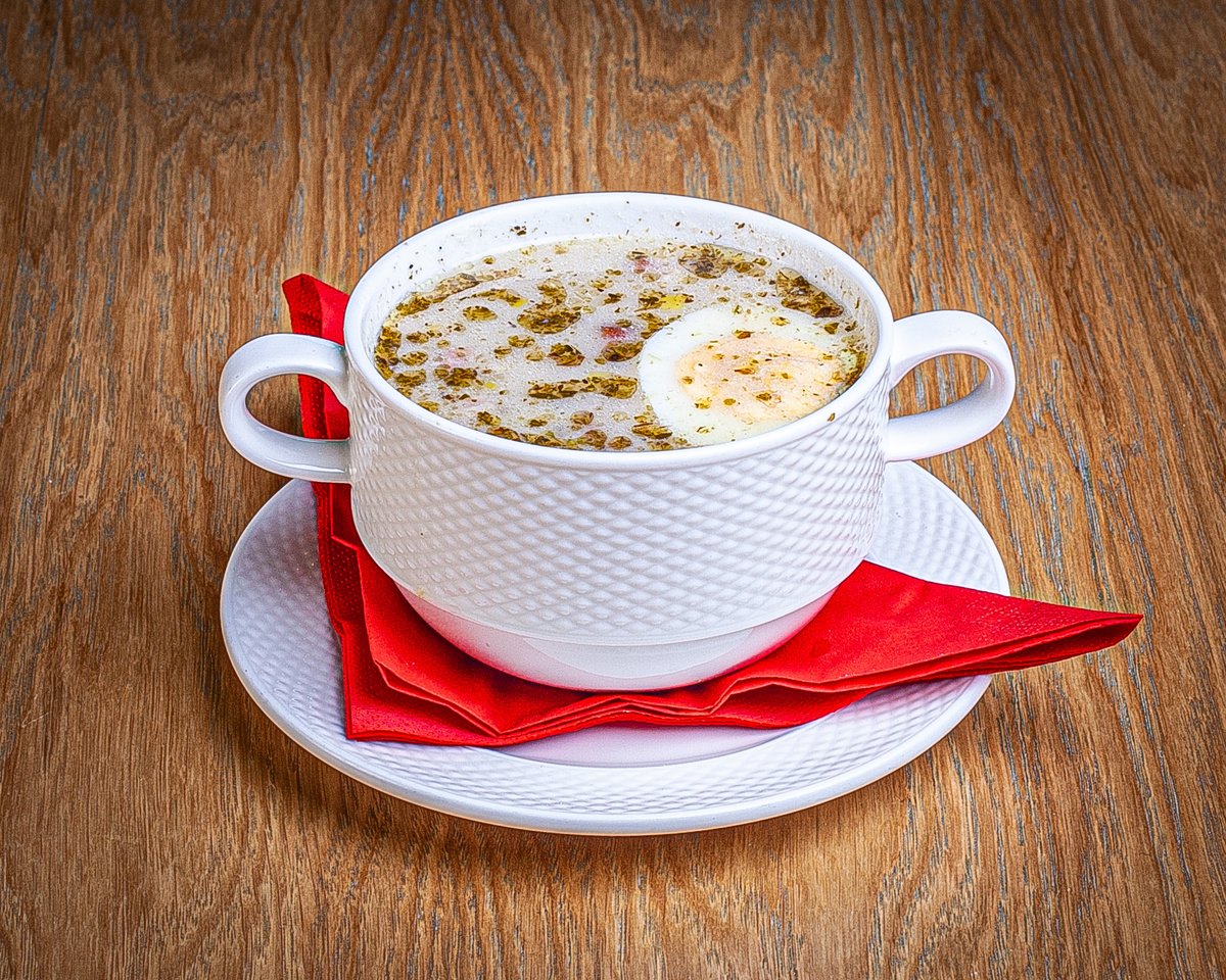 Żur na zakwasie z białą kiełbasą, boczkiem i ziemniakami z dodatkiem chrzanu