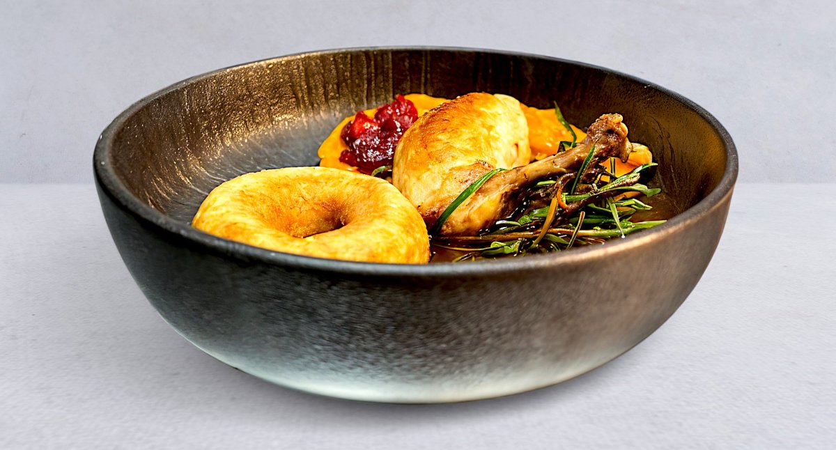 Puree ziemniaczane, ragu grzybowe, pieczona dynia z serem kozim