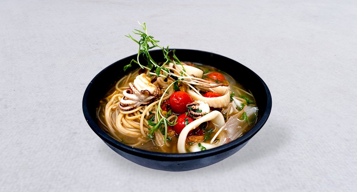 Krewetki, makaron pełnoziarnisty kalmar, ośmiorniczka baby, mule ryba
