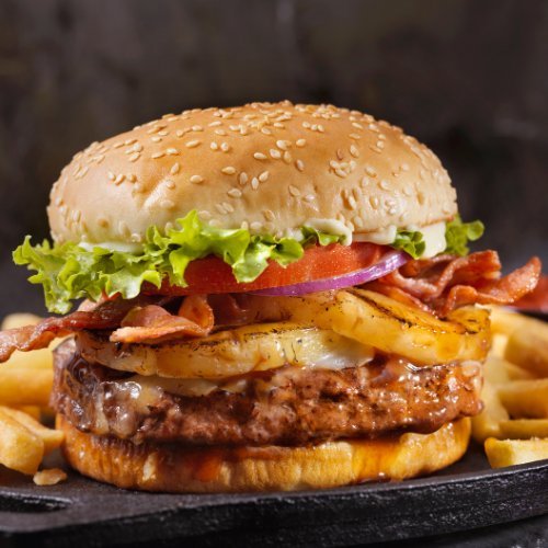 Hamburger z boczkiem, frytki 100 g i napój do wyboru