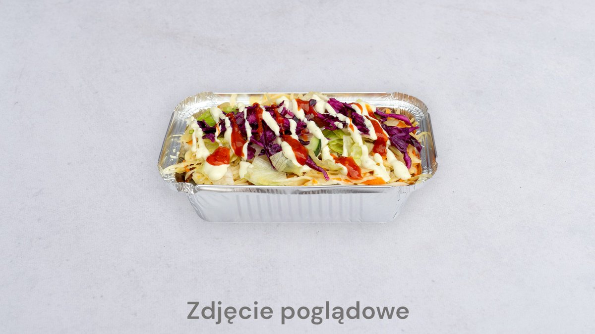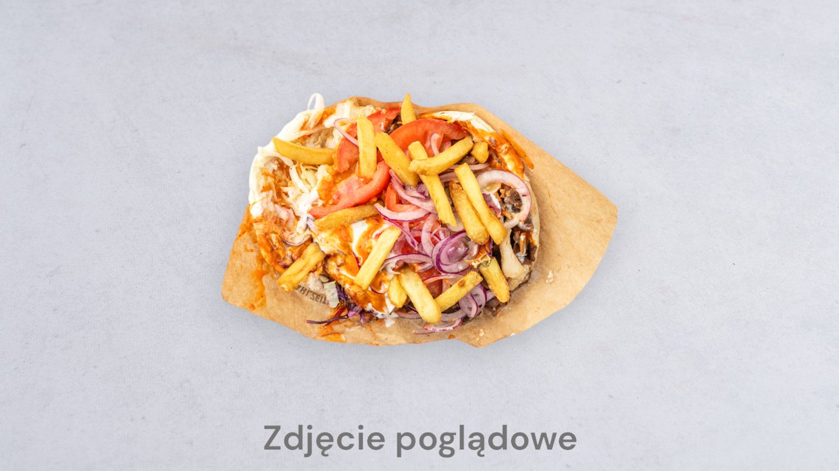 Frytki, mięso, surówka, mozzarella, sos