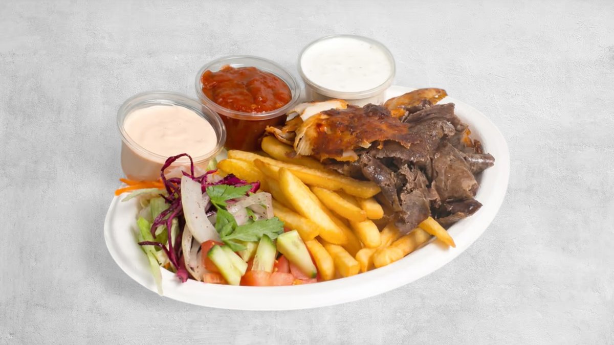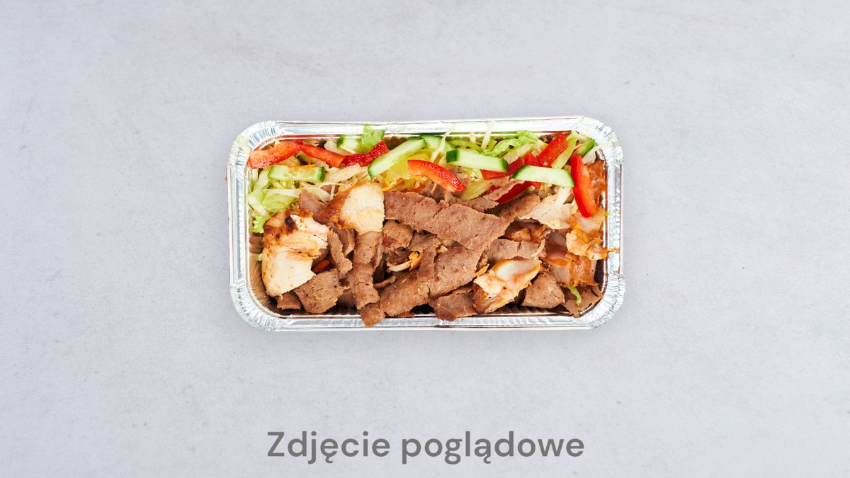 Frytki , mięso, surówka, ser feta, oliwki, sos