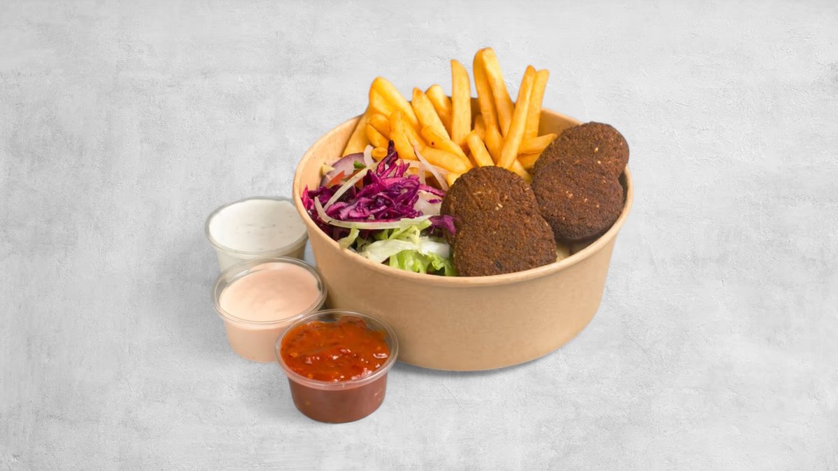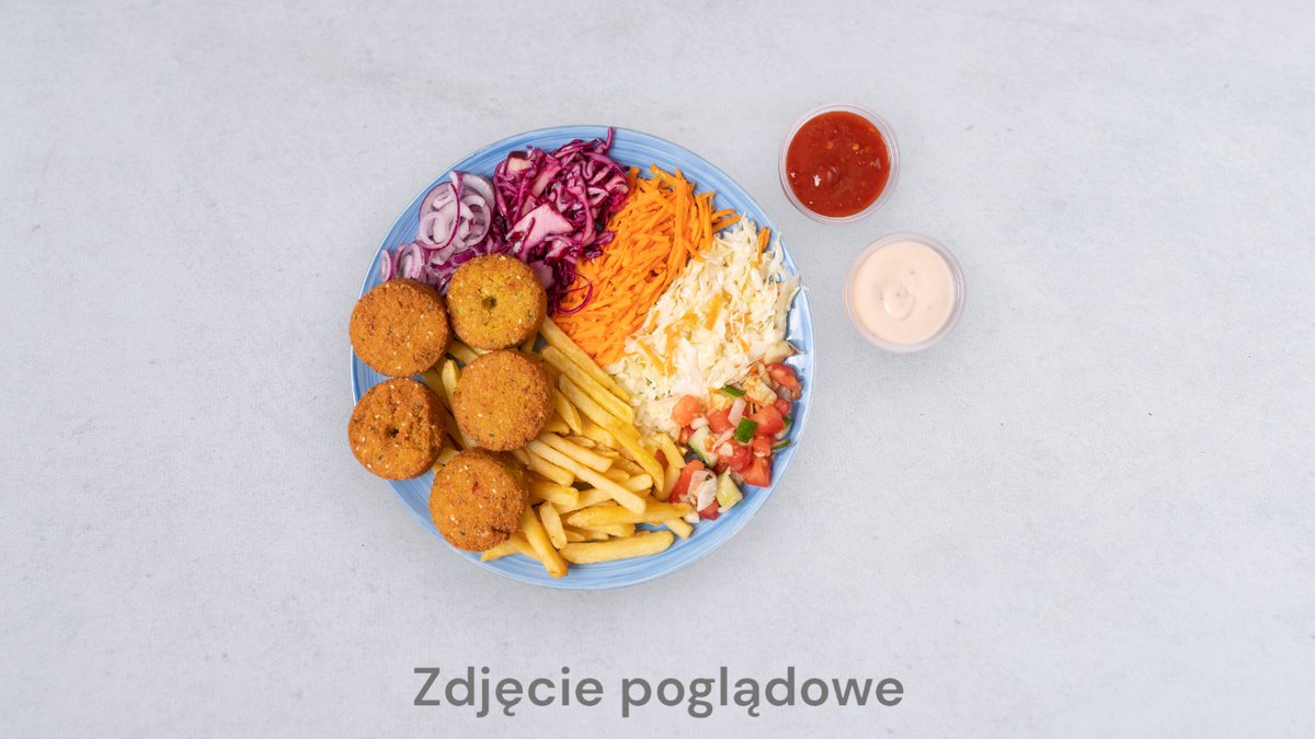 Frytki, falafel, surówka, sos