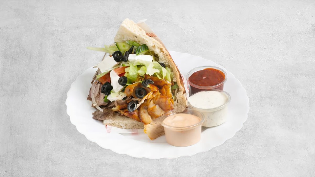 Mięso, surówka, ser feta, oliwki, sos