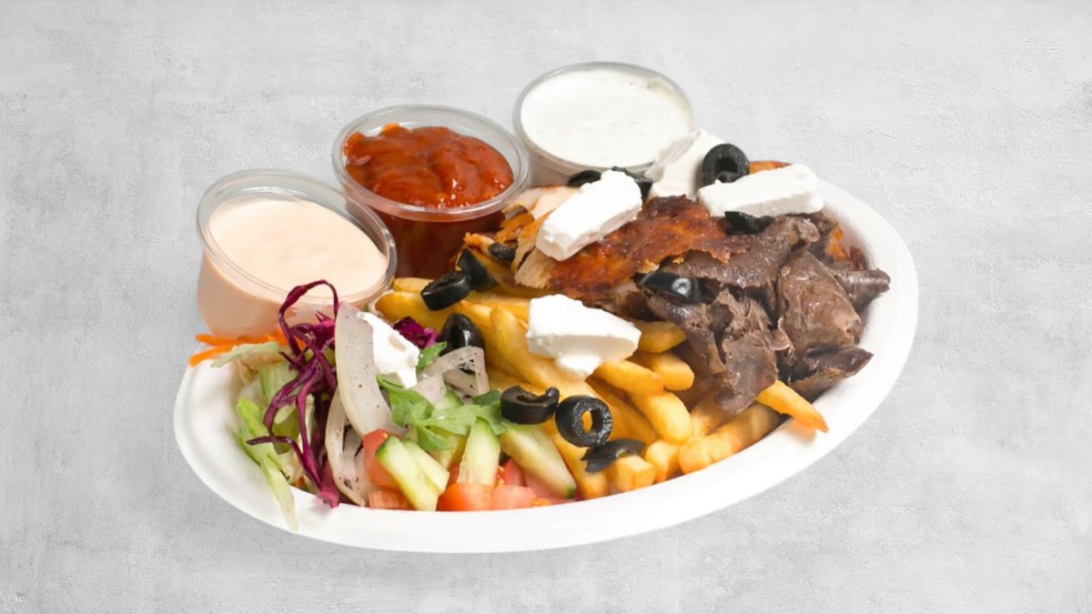 Frytki, mięso, surówka, ser feta, oliwki, sos