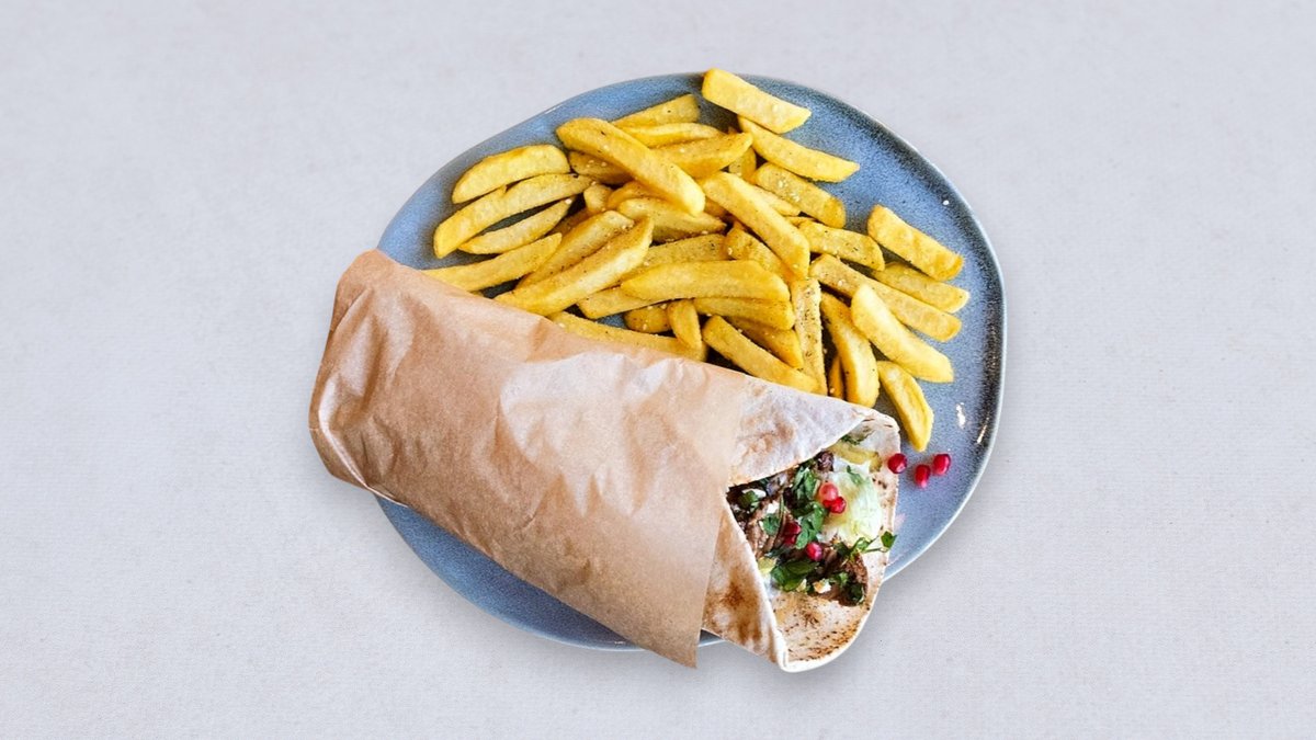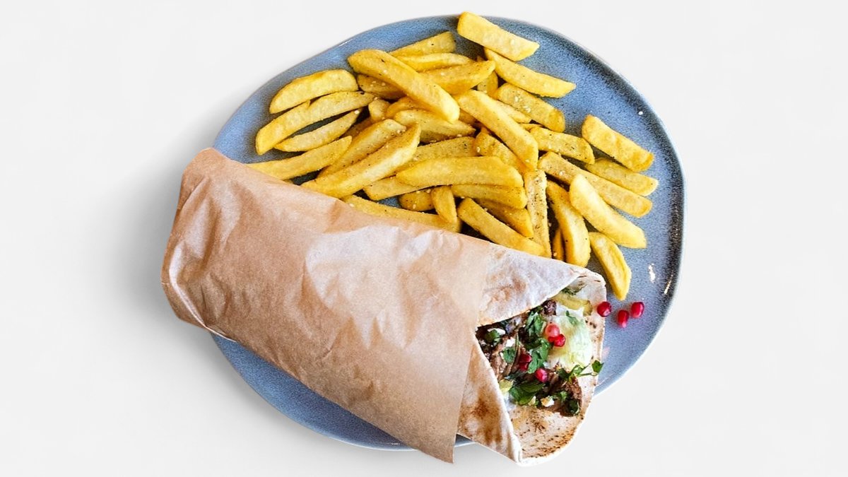 150g aromatycznego mięsa wołowego z grillowanymi warzywami, piklami, sosem tahini, aioli i sosem mango + frytki ze świeżych ziemniaków z zatarem