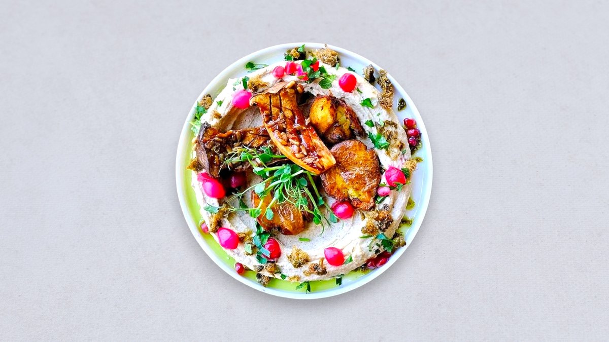 hummus truflowy / boczniak królewski / miso / gniecione patatki / cebula marynowana / prażone kapary / oliwa zielona / chleb pita lub słupli warzywne
