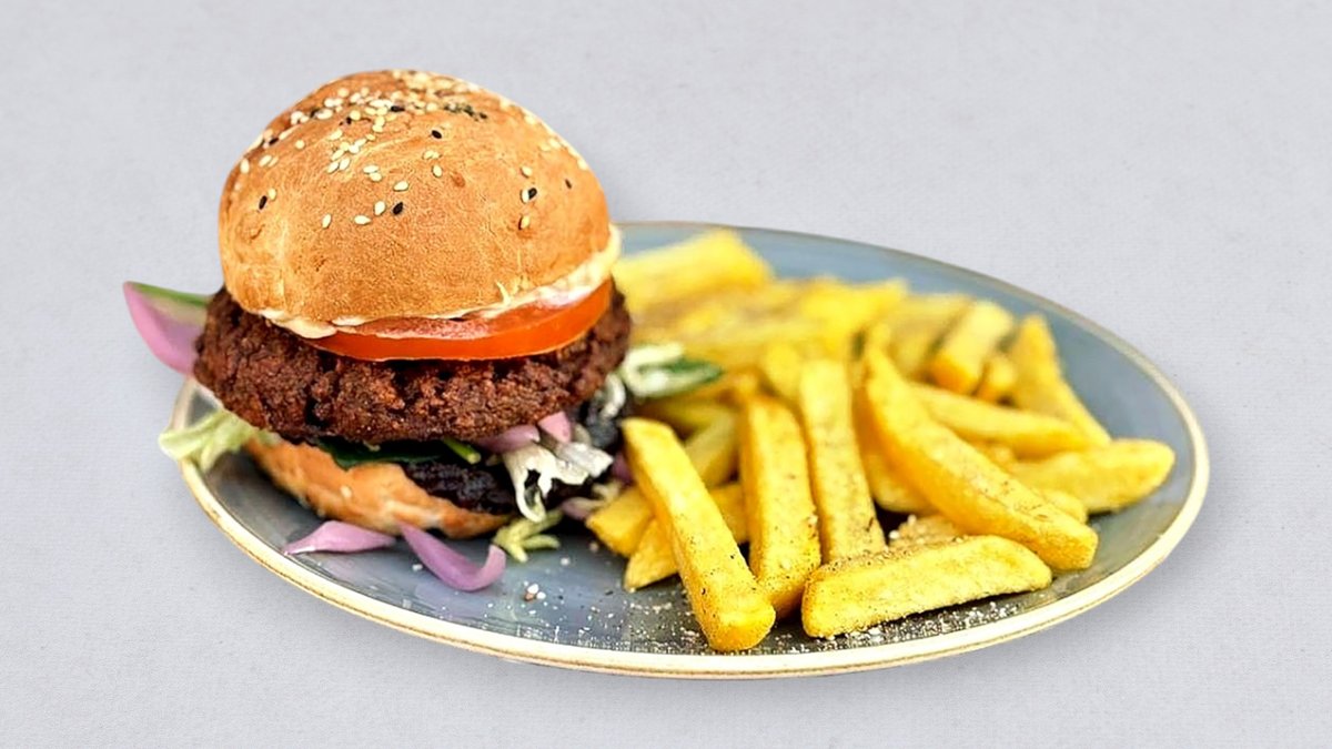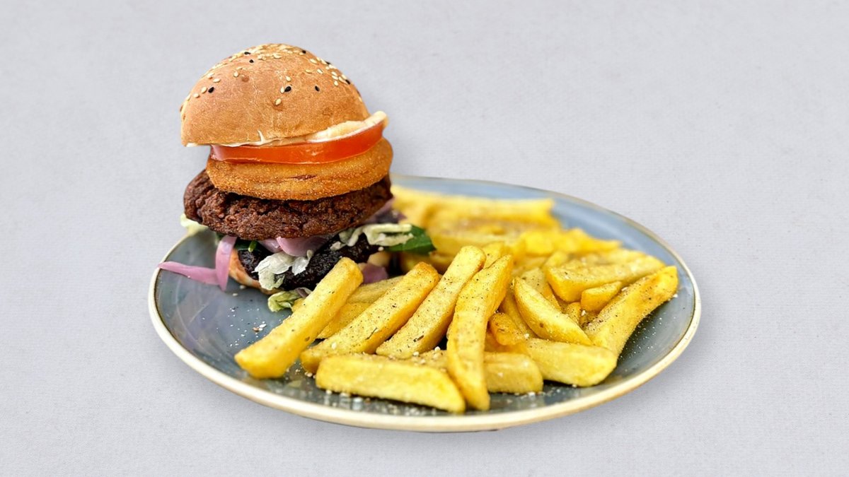 sławny kotlet Beyond, na naszej vegan 'maślanej' bułce, sojonez, ketchup, pomidor, cebula, ogórek kiszony, sałata lodowa + frytki ze świeżych ziemniaków z zatarem