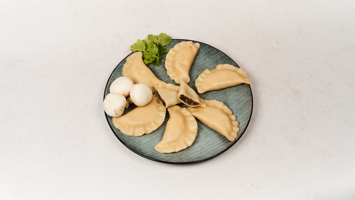 Wegańskie pierogi z farszem z soczewicy, delikatnych pieczarek oraz podsmażonej cebuli.