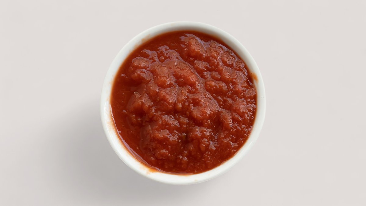 Sos pomidorowy, grillowana papryka, grillowany bakłażan, cukinia, czerwona cebula