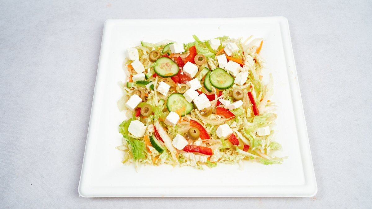 Sałata lodowa, ser feta, ogórek, pomidor, oliwki, papryka