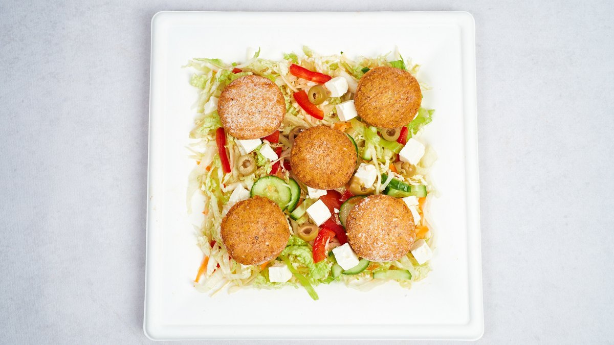 Falafel, frytki, surówki, sos
