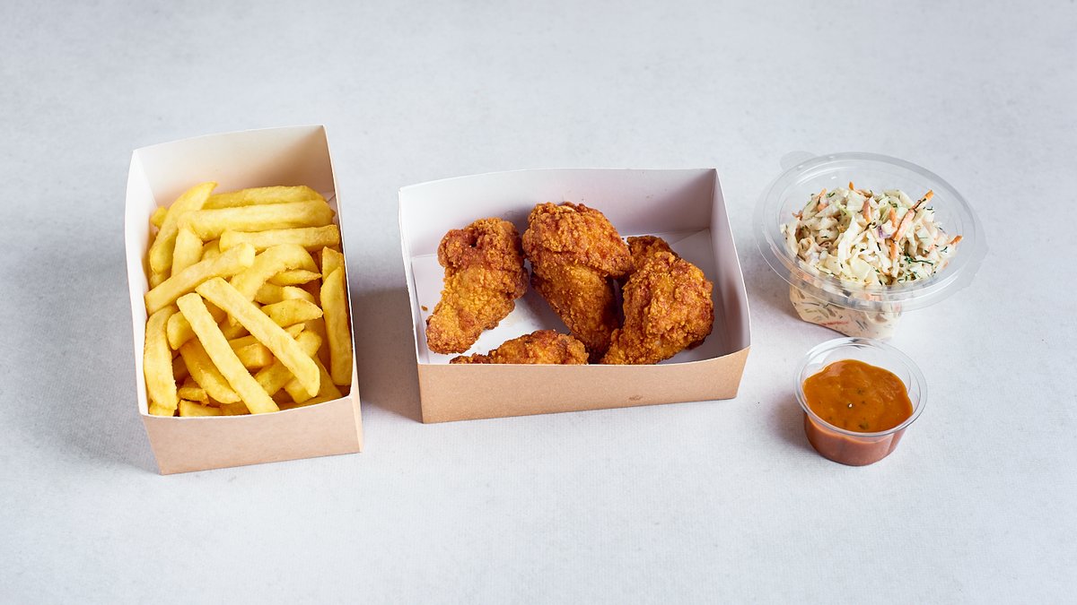 Skrzydełka, frytki, sos