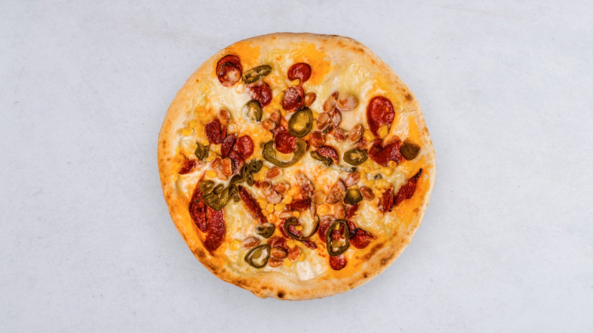 Creme fraiche, mozzarella, chorizo, jalapeno, fasola borlotti, kukurydza
