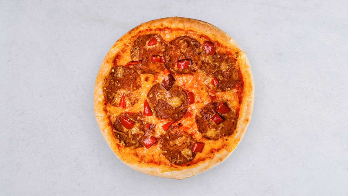 Sos pomidorowy, mozzarella, kiełbasa veneta, boczek pancetta, cebula czerwona, ogórek kiszony