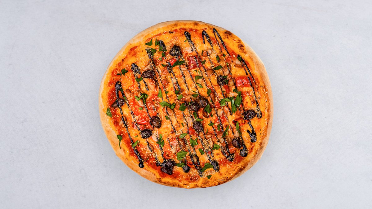 Sos pomidorowy, taleggio, gorgonzola, oliwki czarne, cebula czerwona, peperoncino, natka pietruszki