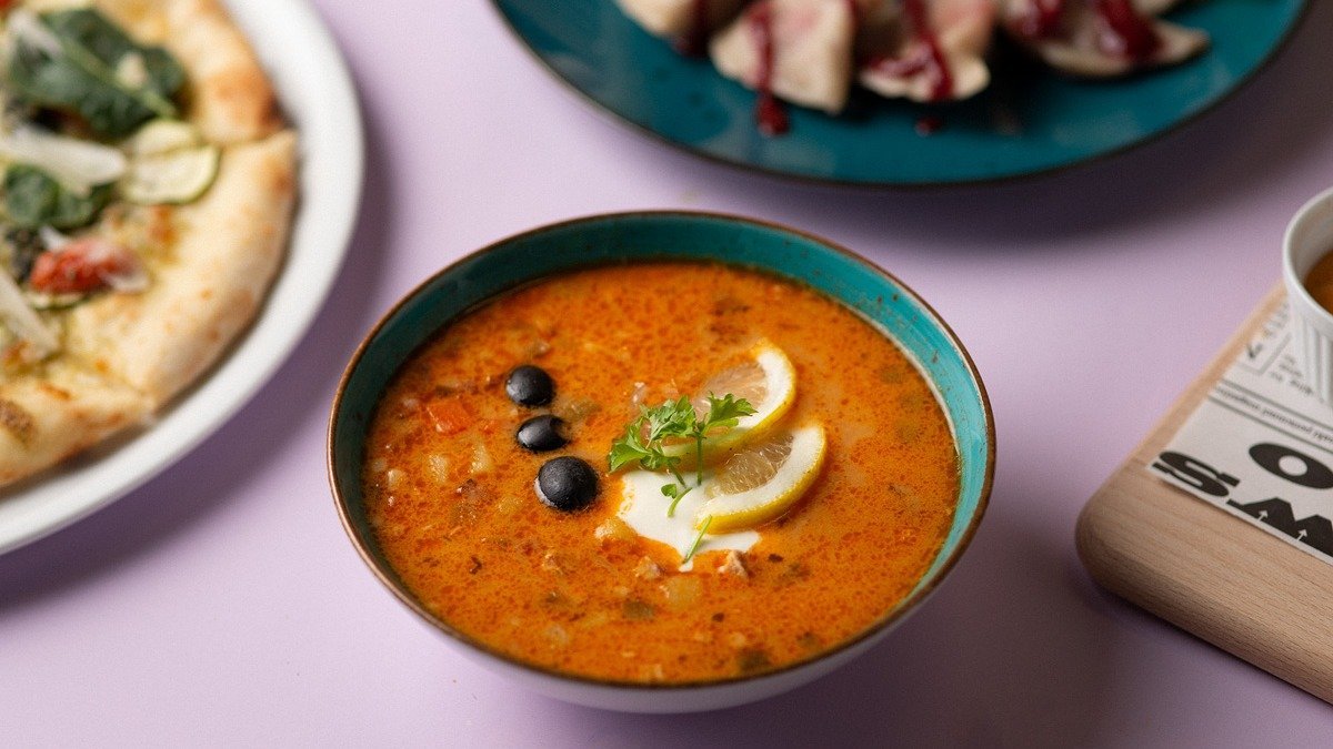 Słowiańska zupa z mięsem wieprzowym, kiszonym ogórkiem, oliwkami i cytryną
