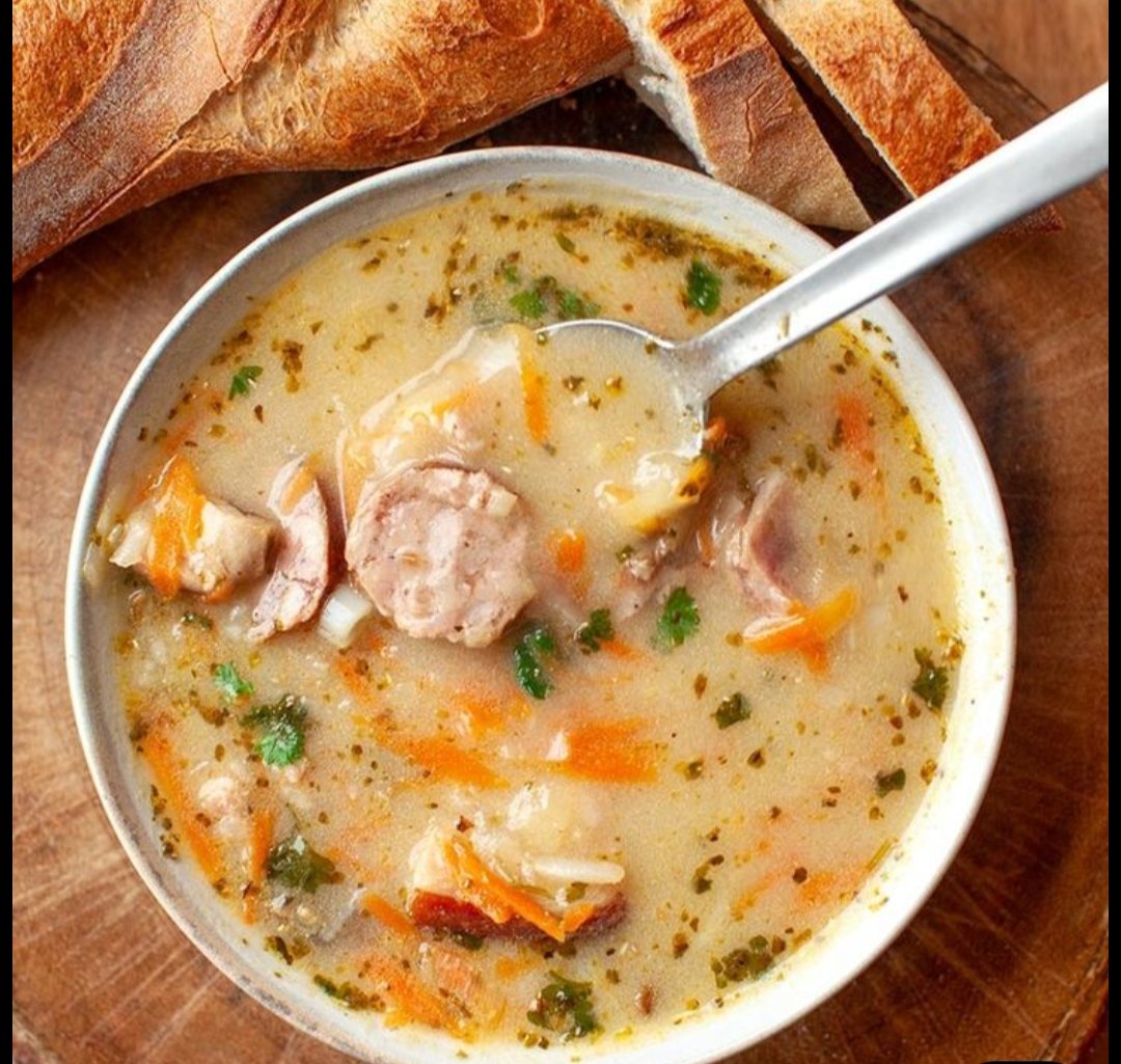Zupa na naturalnym zakwasie, gotowana na wędzonych żebrach i boczku, białej i wędzonej kiełbasie chrzanie i majeranku. Podawane z jajkiem