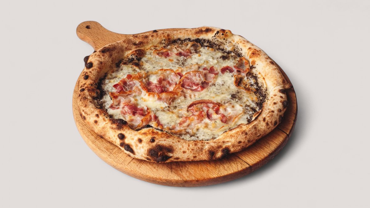 Sos pomidorowy, Mozzarella Fior di Latte, ser wędzony Provola, ser Grana Padano, włoski dojrzewający boczek Pancetta