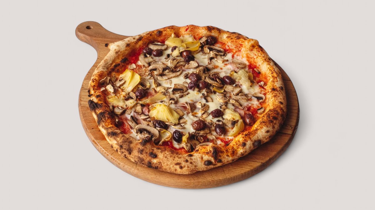 Sos pomidorowy, Mozzarella Fior di Latte, szynka gotowana Cotto, pieczarki, karczochy, oliwki Taggiasche