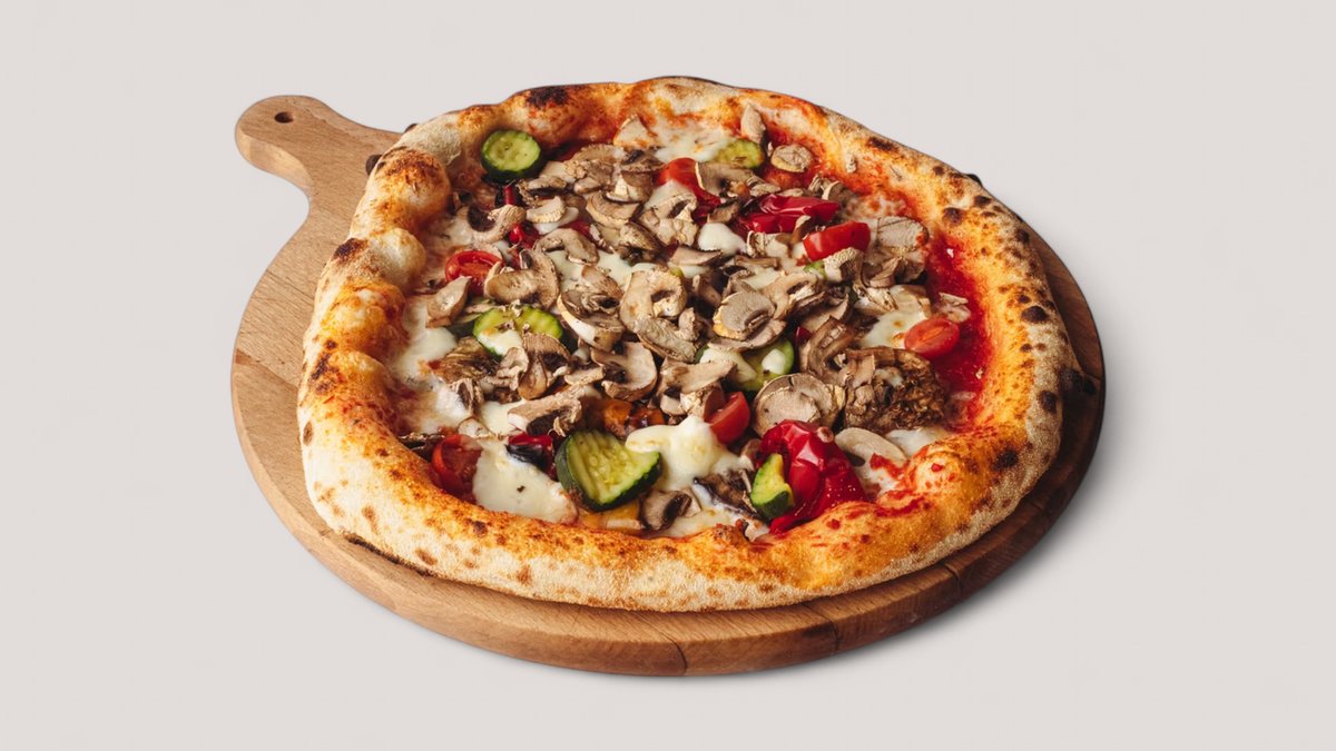 Sos pomidorowy, Mozzarella Fior di Latte, cukinia, grillowana papryka, grillowany bakłażan, pieczarki, pomidorki koktajlowe