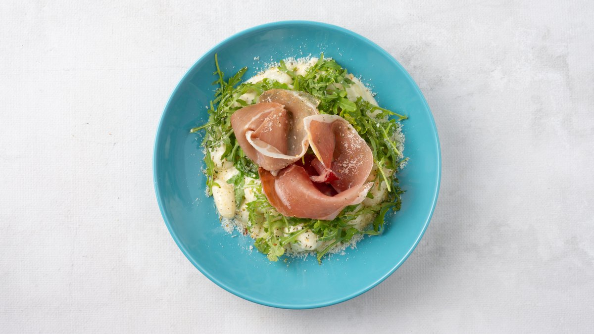 Gnocchi ziemniaczane, sos biały, szynka parmeńska, gorgonzola, rukola, grana padano
