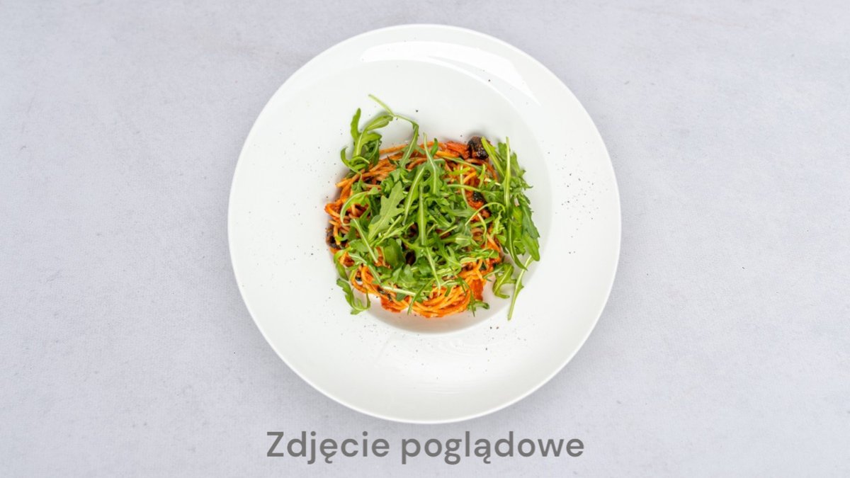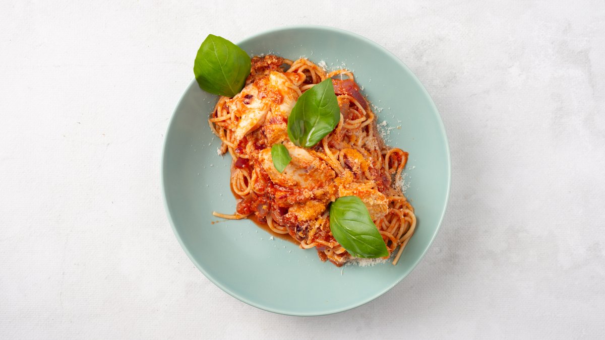 Makaron spaghetti, sos pomidorowy, kurczak, czosnek, cebula, grana padano, rukola