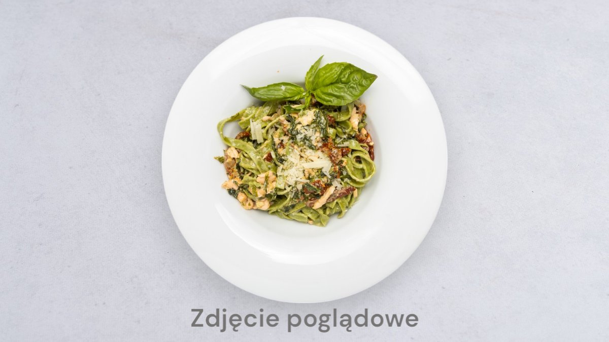 Makaron spaghetti, kurczak, gorgonzola, pieczarki, śmietana, rukola, grana padano