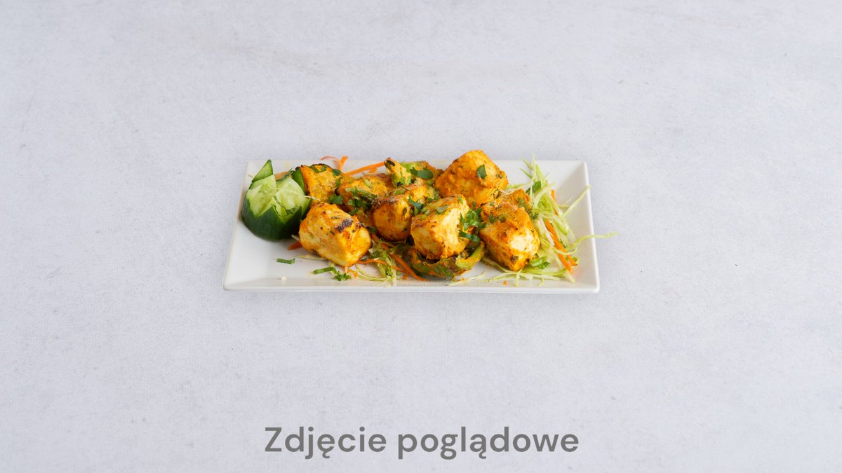 Cihcken Tikka, ogórek, pomidory, papryka, marchewka, cebula, sałata lodowa, oliwa z oliwek, majonez i indyjskie dipy