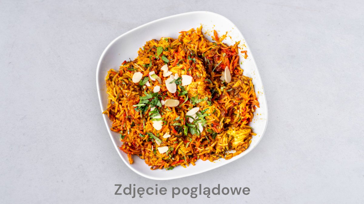 Gotowany ryż z kurczakiem w sosie cebulowo-pomidorowym z aromatycznym smakiem indyjskich przypraw