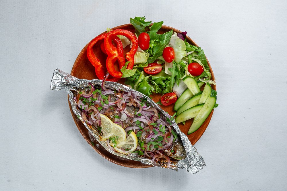 Cały pieczony pstrąg z warzywami i sosem z granatu